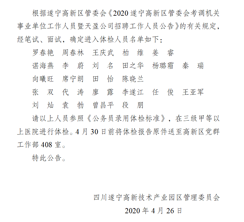 关于2020年公开考调机关事业单位工作人员暨天盈公司招聘工作人员体检的公告