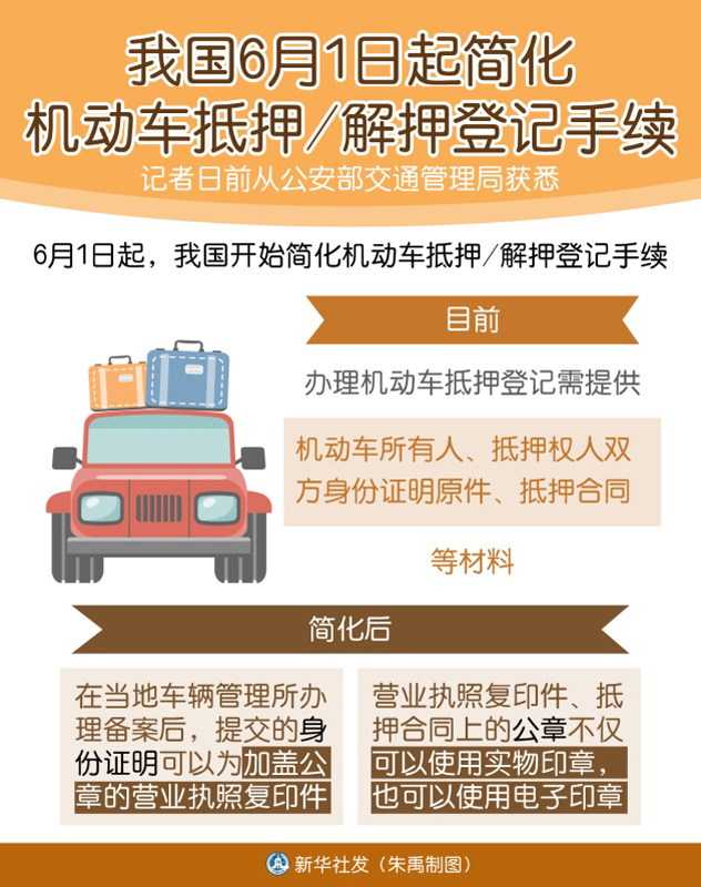 我国6月1日起简化机动车抵押/解押登记手续
