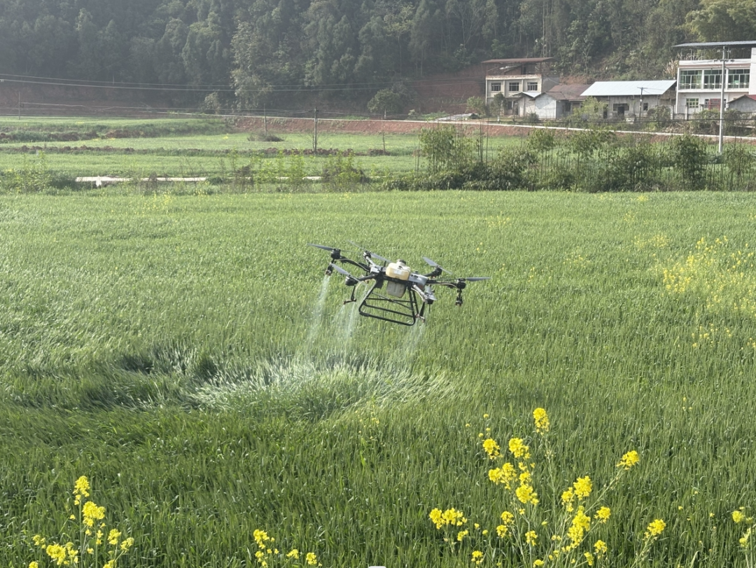 “现在是出穗关键期,防住病虫害,丰收才有保障!”遂宁市禾田专业种植合作社法人黄朝阳站在田埂上,望着眼前的“科技护粮”场景信心满满。作为当地的种植大户,去年11月,他在和兴村承包了1000亩土地播种冬小麦,当起了“农场主”。