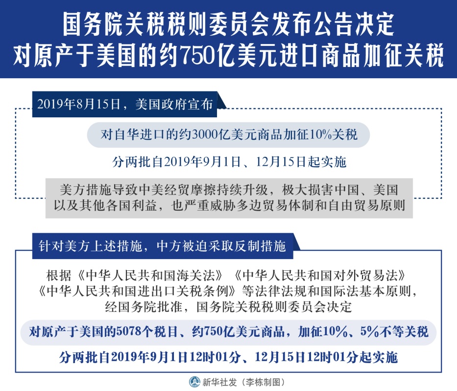 国务院关税税则委员会发布公告决定对原产于美国的约750亿美元进口商品加征关税