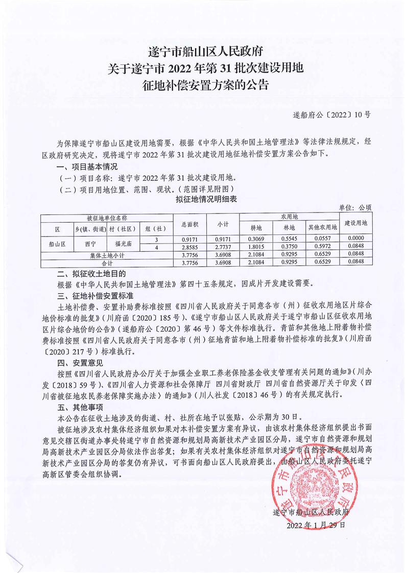 遂宁市船山区人民政府关于遂宁市2022年第31批次建设用地征地补偿安置方案的公告