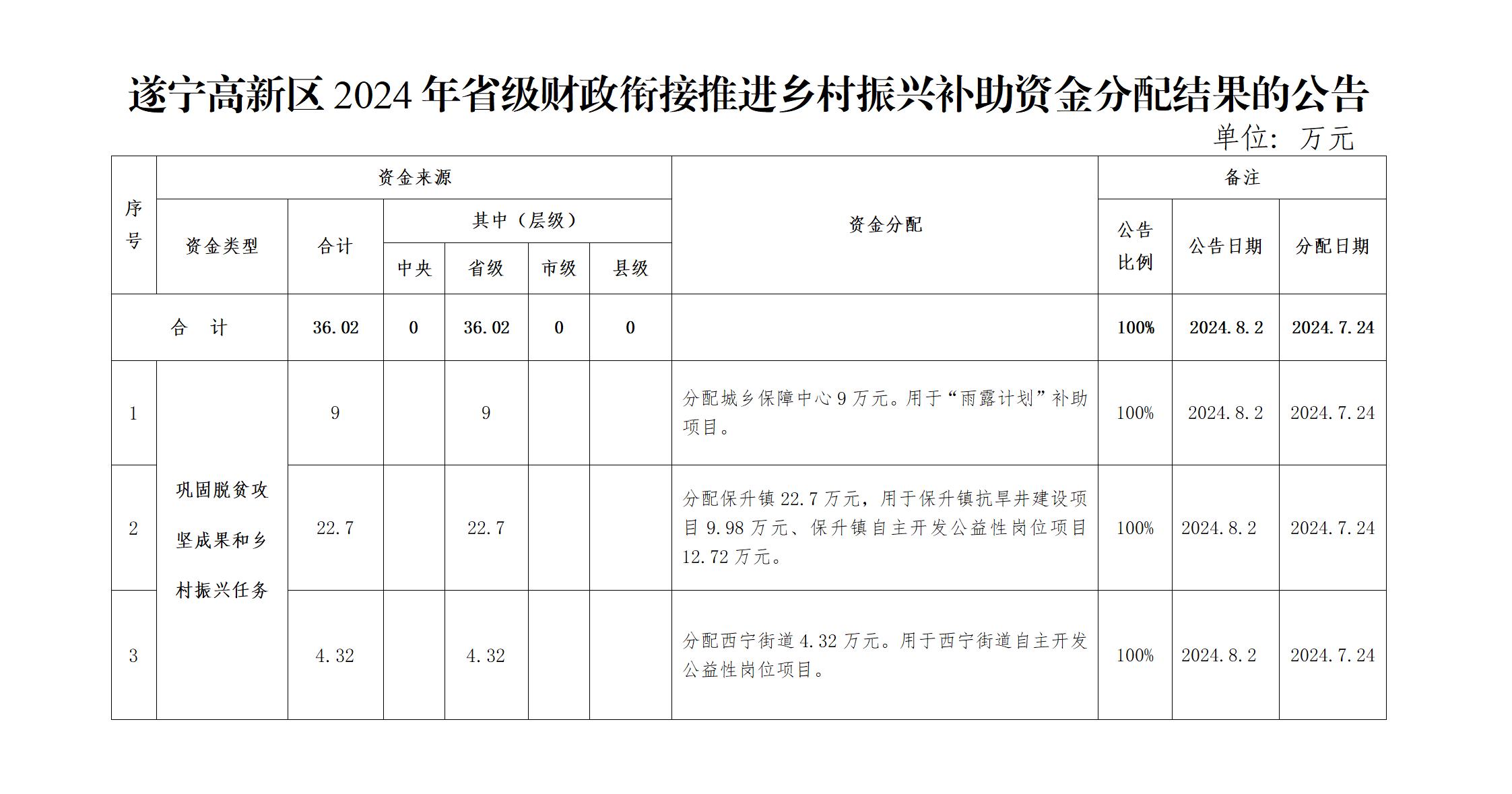 遂宁高新区财政金融局《关于下达2024年中央和省级财政衔接推进乡村振兴补助资金预算的通知》(遂高管财农〔2024〕17号),下达2024年度省级财政衔接资金36.02万元,现将资金分配情况予以公告。