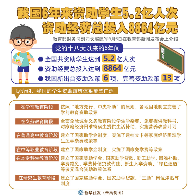 我国6年来资助学生5.2亿人次资助经费总投入8864亿元