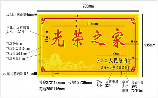 光荣牌(式样图附后)材质为钛金牌,底色为金黄色、沙底镀金;规格为280毫米×135毫米,厚度1毫米;“光荣之家”字样为红色套亮金边,方正魏碑简体132号字,四个字规格为202毫米×43毫米,距上边31毫米,左右居中;“×××人民政府”字样为方正宋体黑色32号简体字,规格为82毫米×11毫米,距下边29毫米,距右边32毫米;左下角配长城图案、亮金色,规格为155毫米×36毫米,距下边15毫米,距左边16毫米;红色花边宽4毫米,距边缘10毫米,花边内线粗0.7毫米,花边外线粗1毫米。右下花边内“退役军人事务部监制”字样为方正宋体黑色20号字,规格为73毫米×6.8毫米,距下边16.5毫米,与“×××人民政府”右端对齐。