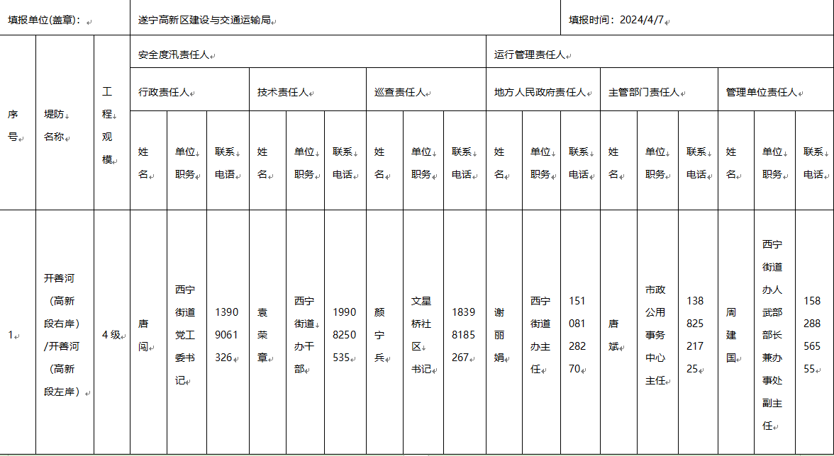 遂宁高新区2024年天然河道内已成堤防安全度汛和运行管理责任人名单