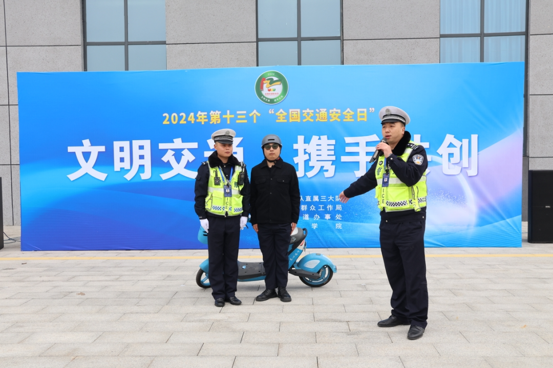 12月2日是第十三个“全国交通安全日” ,今年的主题是“文明交通 携手共创”。当天,市公安局交警支队直属三大队民辅警走进遂宁职业学院,开展了一场别开生面的交通安全宣传活动,为师生们送上交通安全知识“大餐”。