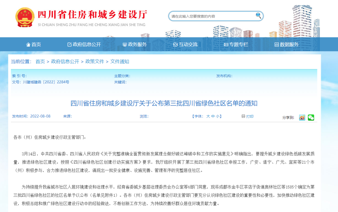 3月14日,中共四川省委、四川省人民政府《关于完整准确全面贯彻新发展理念做好碳达峰碳中和工作的实施意见》明确指出,要提升城乡建设绿色低碳发展质量,推进绿色社区建设。按照《四川省绿色社区创建行动实施方案》要求,省住建厅组织开展了第三批四川省绿色社区申报工作,广安、遂宁、广元、宜宾等21个市(州)积极参与,合力推进绿色社区建设,涌现出一批安全健康、设施完善、管理有序的完整居住社区。