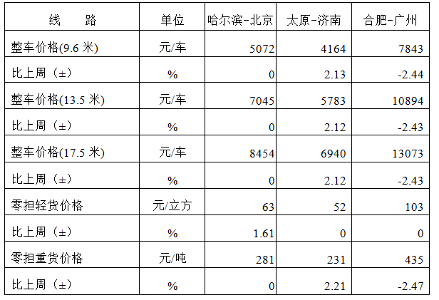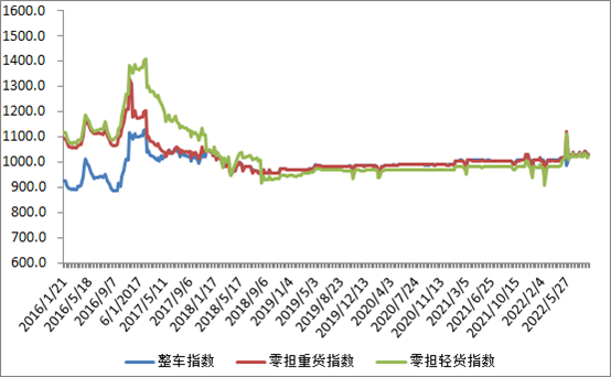 分车型看,各车型指数环比涨跌互现。其中,整车指数为1028.97点,与上周基本持平;零担轻货指数为1026.65点,比上周回升0.71%;零担重货指数为1028.62点,与上周基本持平。
