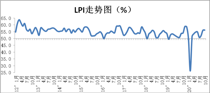 中国物流与采购联合会发布的2020年10月份中国物流业景气指数为56.3%,较上月回升0.2个百分点;中国仓储指数为52.8%,较上月回升2个百分点。