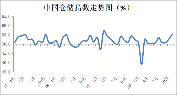 中国物流与采购联合会发布的2020年11月份中国物流业景气指数为57.5%较上月回升1.2个百分点;中国仓储指数为56.9%,较上月回升4.1个百分点。