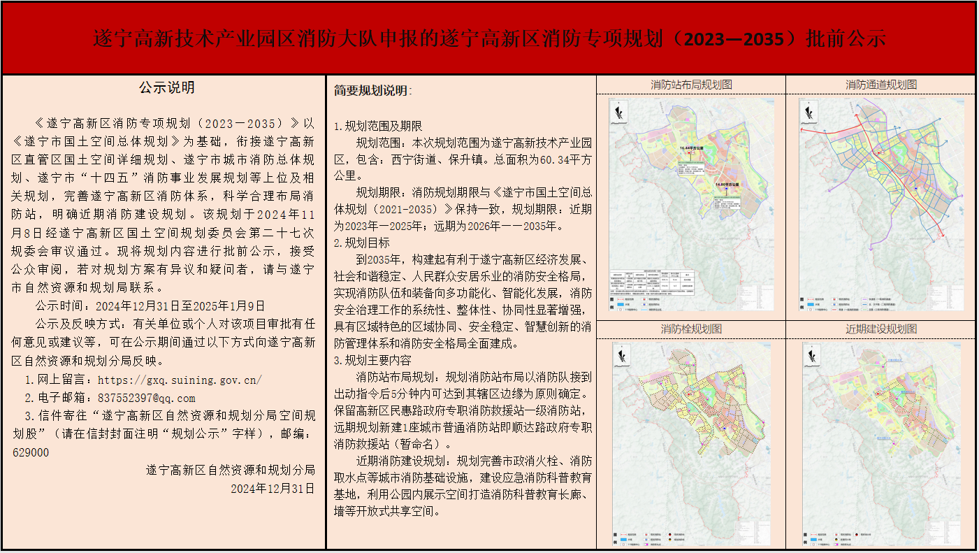 遂宁高新技术产业园区消防大队申报的遂宁高新区消防专项规划(2023—2035)批前公示