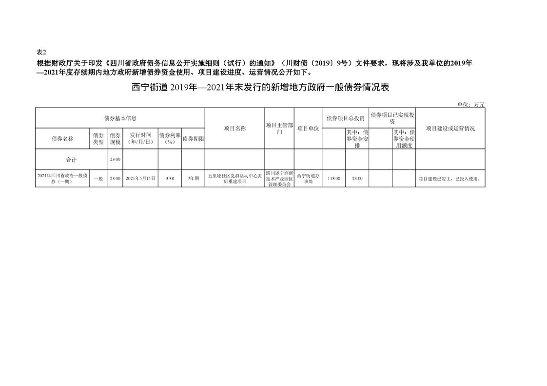 西宁街道 2019年—2021年末发行的新增地方政府一般债券情况表