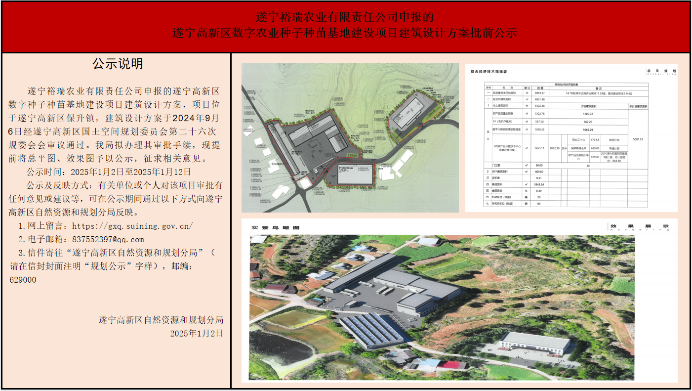 遂宁高新区数字农业种子种苗基地建设项目建筑设计方案批前公示
