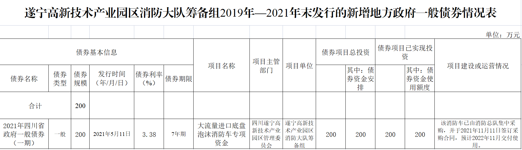遂宁高新技术产业园区消防大队筹备组2019年—2021年末发行的新增地方政府一般债券情况表